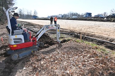 Der Minibagger kommt nur zum Einsatz, um einen Graben neben dem Ameisenhügel auszuheben. So können die Umzugshelfer sehen, wie breit sich das Nest unter der Erde ausgedehnt hat. Foto: Frank Höfer