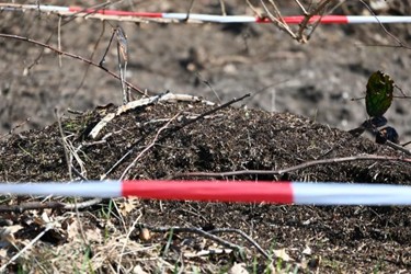 Ein paar Bäume durften zuvor gefällt werden, zwei Ameisenhügel blieben unangetastet. Der eine befindet sich knapp außerhalb des Ausbaubereichs und darf bleiben, wo er ist. Damit ihn die Bauarbeiter nicht versehentlich beschädigen oder dem Erdboden gleichmachen, wurde das Nest mit Flatterband eingegrenzt.